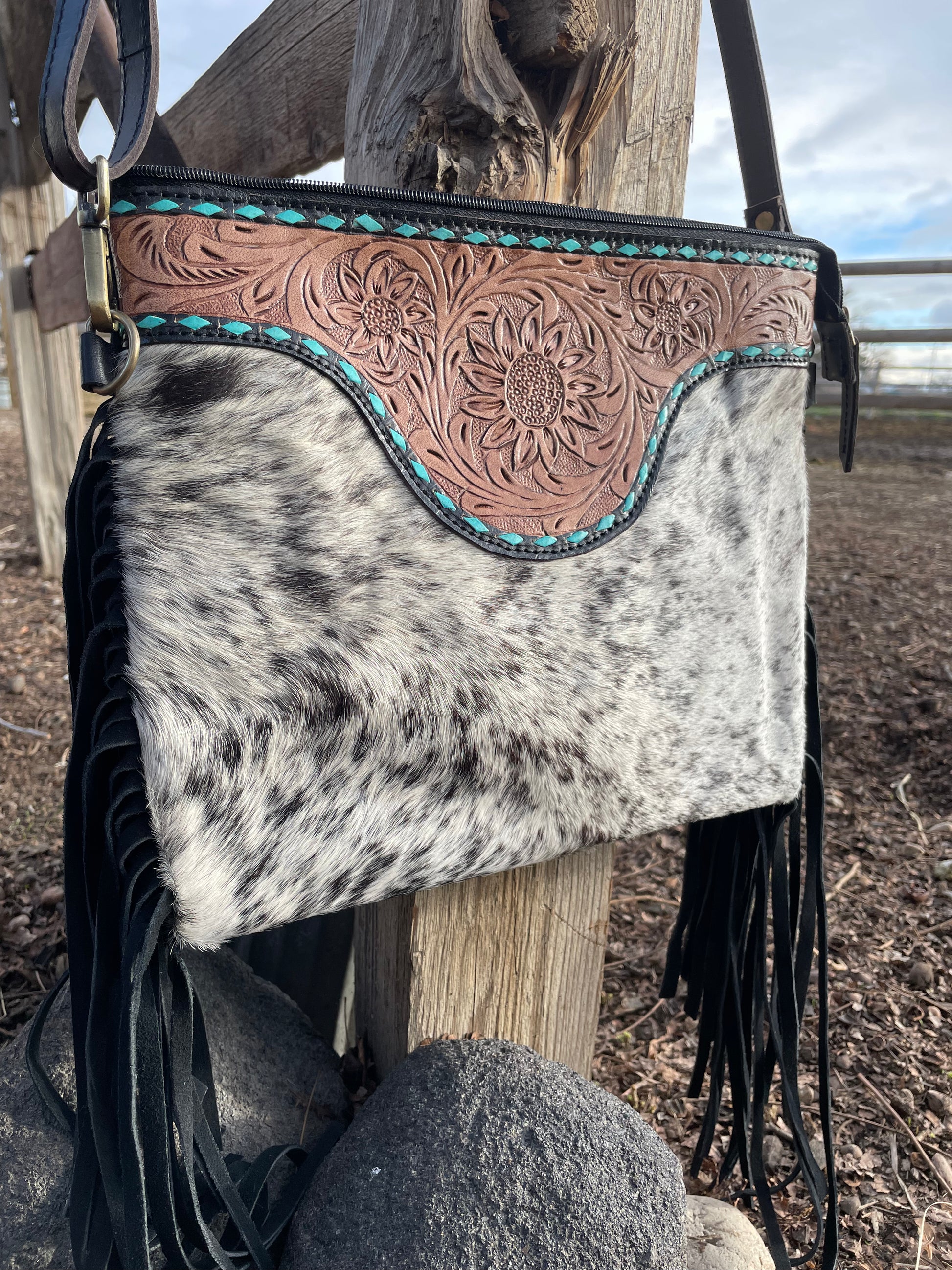 Cowhide Tooled Fringe Purse with Turquoise